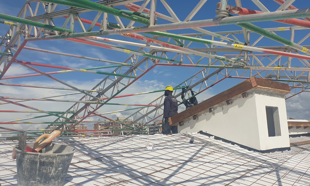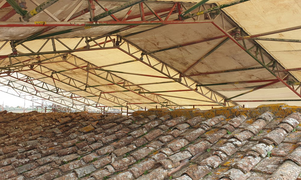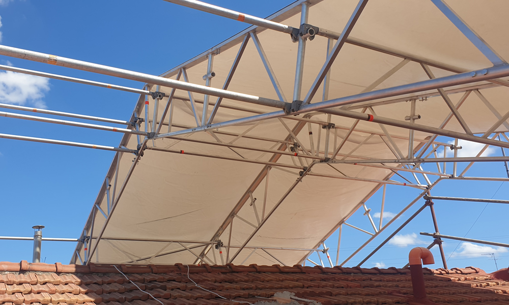 Istallazione e progettazione di coperture fisse o con binario mobile con teli in pvc, adeguabili a tutti i tipi di ponteggi.